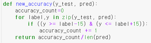 정답값(중간값인 5, 15, 25 ~)에 ±15일 오차를 허용한 새로운 정확도 산출 함수를 정의하여 회귀 모델 성능 지표인 RMSE, r2_score와 함께 산출했다.