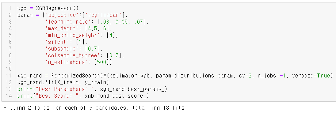 아래와 같이 하이퍼파라미터를 설정하였고, 그 결과 base xgboost 모델보다 개선되었음을 확인할 수 있다.