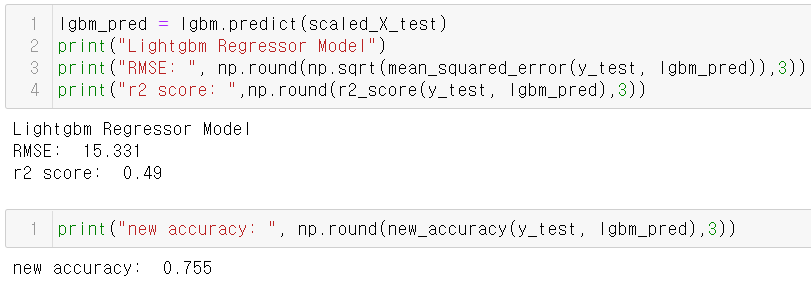 랜덤 포레스트 모델의 성능 위의 new accuracy는 회귀 모델의 평가를 위해 우리가 자체적으로 개발한 성능 평가 함수이다.