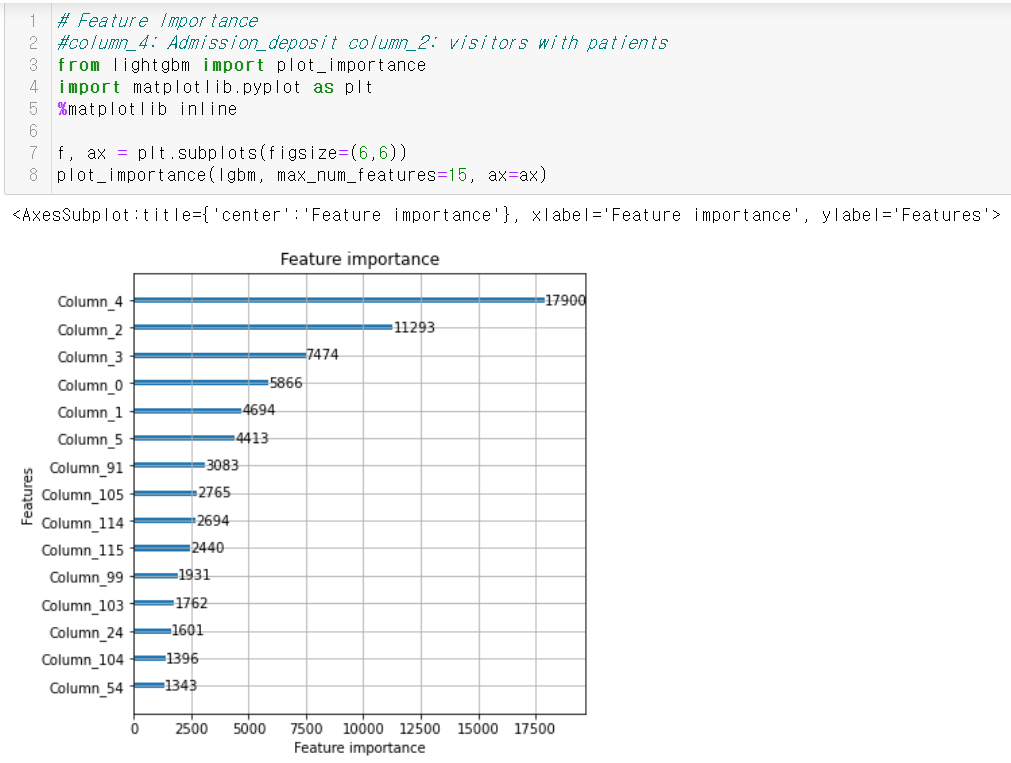 Lightgbm 모델의 변수 중요도 그래프 Column_4는 예치금, Column_2는 방문자 수, Column_3은 나이, Column_0은 잔여 병실 수로 앞의 두 모델의 변수 중요도와 결과가 조금 다르다.